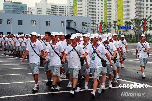 7月15日早上,駐京海軍某部300名官兵身著統(tǒng)一服裝到鳥巢參加奧運(yùn)開幕式彩排。據(jù)了解,北京奧組委采取嚴(yán)格的保密措施防止開幕式節(jié)目?jī)?nèi)容泄露,為此“鳥巢”外圍戒備森嚴(yán),共有三層隔離護(hù)欄,由公安、武警把守!傍B巢”上空的制高點(diǎn)也被全面封鎖,防止高空偷拍。 中新社發(fā) 楊慧峰 攝