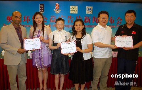 7月15日,在舉世矚目的北京奧運(yùn)會(huì)即將開幕之際,由11位中國(guó)奧運(yùn)冠軍傾情出演的“奧運(yùn)環(huán)保公益廣告片”在北京舉行首映式。由中國(guó)環(huán)境意識(shí)項(xiàng)目出資拍攝的這部公益廣告片,不僅受到了北京奧組委的鼎力支持,而且得到了王軍霞、鄧亞萍、樓云、高敏、樂靖宜、楊揚(yáng)、楊凌、羅雪娟、桑雪和李永波等奧運(yùn)冠軍和著名教練的熱烈響應(yīng)。圖為羅雪娟(左二)、桑雪(左三)和楊凌(右一)代表其他冠軍接受公益廣告拍攝紀(jì)念證書。中新社發(fā) 潘旭臨 攝