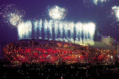 昨晚,北京奧運會開幕式首次大規(guī)模帶妝彩排在鳥巢舉行,并試放禮花。 騰空的禮花在鳥巢上空釋放。首次全身亮燈的鳥巢與空中的禮花交相輝映。遠看,鳥巢和禮花融為一體,在晴好的夜空中格外奪目。(通訊員 李吉 記者 李艾 攝影報道)