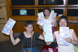 16日人龍主要集中有銷售含五個(gè)品種奧運(yùn)紀(jì)念鈔的十家支行,尤以筷子基支行、佑漢新邨支行等人氣最旺?曜踊16日早7時(shí)半率先派籌,正式銷售則仍須至9時(shí)開(kāi)始,持籌居民分批進(jìn)入銀行購(gòu)買。