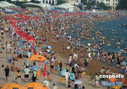 青島第一海水浴場游泳的游人爆滿。經(jīng)過一個(gè)多月的全力奮戰(zhàn),困擾2008北京奧運(yùn)會帆船賽舉辦地青島的近海滸苔已得到了有效的清除和遏制,奧帆賽訓(xùn)練比賽場地和海水浴場又恢復(fù)了往日的熱鬧景象。中新社發(fā) 曲連遵 攝