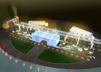 廣場內(nèi)最受矚目的,是聳立于鐘樓前的半透明迷你“水立方”模型,晚上配合藍(lán)色燈光,將水立方的晶瑩剔透表露無遺,市民可以穿過水立方作近距離接觸,而奧運吉祥物福娃會站立于水立方側(cè)。每晚8點半至10點,每隔半小時水立方將加插燈光匯演,在奧運主題音樂“We are ready”音效下,呈現(xiàn)千變?nèi)f化的燈光效果。