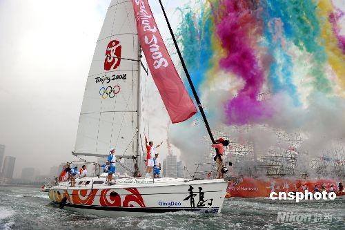 北京奧運火炬7月21日來到了北京奧運帆船賽主辦地-青島進(jìn)行傳遞。經(jīng)過陸地三棒傳遞,奧運火炬開始了海上傳遞,共有四棒火炬手通過“青島號”大帆船進(jìn)行傳遞,這是奧運火炬?zhèn)鬟f過程中首次進(jìn)行海上傳遞。圖為火炬手傳遞火炬時,海岸上燃放起彩煙。中新社發(fā) 廖攀 攝