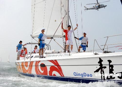 7月21日,青島浮山灣,奧運火炬在青島號帆船上傳遞。中新社發(fā) 廖攀 攝