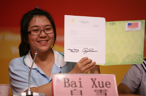 中新網(wǎng)7月21日電 一名來自北京市八一中學(xué)的普通女生白雪,受到學(xué)校一次假期作業(yè)的啟發(fā),給各國總統(tǒng)寫了宣傳北京綠色奧運(yùn)的信件。目前,她已收到了包括法國總統(tǒng)薩科齊、韓國前總統(tǒng)盧武鉉、德國總理默克爾、澳大利亞前總理霍華德等元首寄回的三十余封回信。