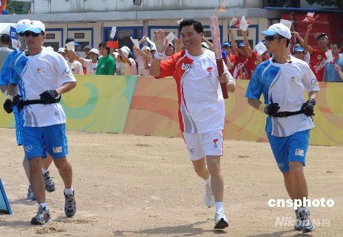 7月21日,奧運(yùn)火炬在山東青島傳遞,最后一棒火炬手青島市委副書記、市長、奧帆委主席夏耕跑進(jìn)傳遞終點(diǎn)青島第一海濱浴場,隨后他點(diǎn)燃圣火盆,青島傳遞結(jié)束。 中新社發(fā) 廖攀 攝