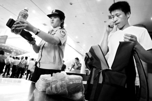 昨天10時(shí)許,記者先來(lái)到北京西站進(jìn)站口,比以往更加嚴(yán)格的是,這里除了對(duì)每件行李進(jìn)行機(jī)檢外,民警還輔助用手持液體查危儀對(duì)行李中的液體進(jìn)行檢查,現(xiàn)場(chǎng)鐵警告訴記者:“如果發(fā)現(xiàn)行李中攜帶了液體,我們將會(huì)要求旅客將液體拿出,并用儀器進(jìn)一步檢測(cè)液體安全!甭每褪掷锬弥钠垦b水,開蓋的則要求當(dāng)場(chǎng)喝一口,沒有開蓋的則也要過(guò)液體安檢儀。