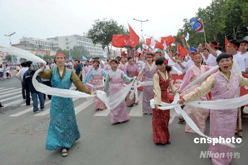 圖:濟(jì)南藏族學(xué)子載歌載舞歡迎奧運(yùn)火炬