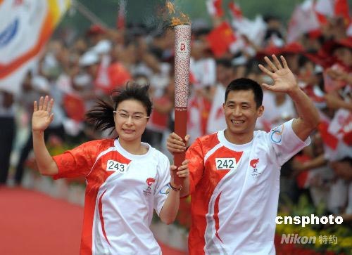 7月23日,奧運(yùn)火炬在山東濟(jì)南傳遞,中國跳水隊(duì)運(yùn)動(dòng)員、世界冠軍郭晶晶、王峰共同傳遞濟(jì)南最后一棒火炬。 中新社發(fā) 廖攀 攝