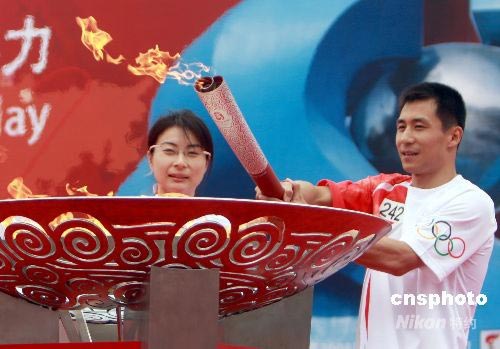 奧運(yùn)火炬在山東濟(jì)南傳遞,中國(guó)跳水隊(duì)現(xiàn)役運(yùn)動(dòng)員郭晶晶、王峰共同傳遞濟(jì)南最后一棒火炬并點(diǎn)燃圣火盆。中新社發(fā) 廖攀 攝