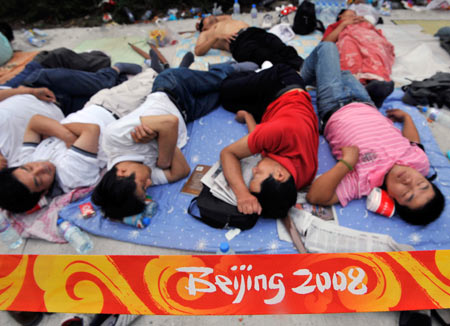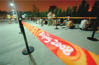 從昨天下午1點開始,已有人趕到朝陽區(qū)北土城東路奧體中心售票處等待購買25日才開售的最后一批奧運(yùn)門票。至昨晚11點,已有300余人趕到排隊,且隊伍仍在不斷擴(kuò)大。