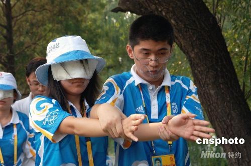 7月23日,北京2008奧林匹克青年營里的志愿者正在進行信任度培訓。該培訓由兩個人進行配合,一個人把眼睛蒙住、一個人把嘴巴封住,完全靠對方的身體語言進行溝通,該培訓將有助于志愿者對奧林匹克青年營里首次招募的殘疾人營員進行幫助。 中新社發(fā) 王東明 攝