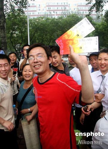 7月25日,北京奧運(yùn)會(huì)籃球比賽門票開(kāi)始在五棵松籃球館發(fā)售,北京的何先生排了60個(gè)小時(shí)的隊(duì),成為第一位購(gòu)得比賽門票的幸運(yùn)者。 中新社發(fā) 甄雪原 攝