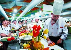 奧運(yùn)村餐廳堪稱“萬人大食堂”,主餐廳位于居住區(qū)的北側(cè),提供24小時(shí)餐飲服務(wù)。記者看到,餐廳設(shè)有四大餐區(qū):國際餐區(qū)、地中海餐區(qū)、亞洲餐區(qū)及中國餐區(qū),還包括猶太餐、清真餐、印度餐等菜品,并有明顯的菜單標(biāo)牌提示,供村民選擇。名聞天下的北京烤鴨也進(jìn)駐了奧運(yùn)村,運(yùn)動(dòng)員每天都可品嘗。餐廳按照70%西餐、30%中餐比例配備菜品,并且菜單8天一個(gè)循環(huán)周期。