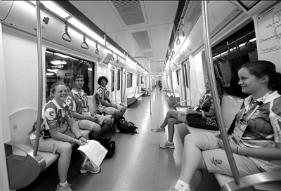 昨天,來(lái)自美國(guó)的志愿者乘坐奧運(yùn)支線返回住處。