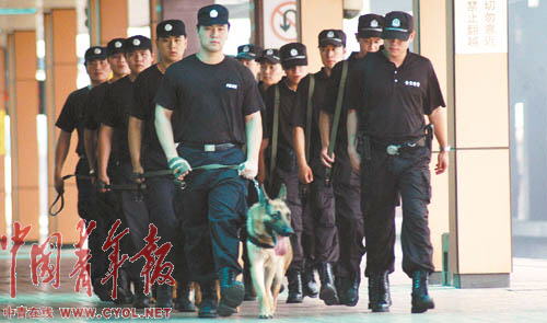 奧運(yùn)會即將舉辦,突發(fā)事件隨時(shí)可能發(fā)生。為此,上海鐵路警方調(diào)集鐵警精銳進(jìn)駐上海站,并成立了鐵路上海站奧運(yùn)安保前線指揮部。7月以來,鐵路特警全副武裝攜警犬在上海站、車站廣場及與地方接合部晝夜進(jìn)行巡邏檢查。
