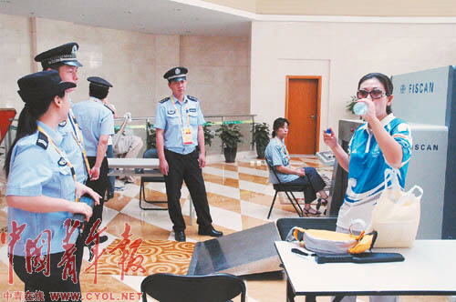 由于目前上海體育場實(shí)施全封閉管理,必須憑有效證件才能進(jìn)入封閉區(qū)域,記者佩戴著奧運(yùn)會注冊記者證進(jìn)入上海體育場。在工作人員的安檢通道:首先,要在專門的驗(yàn)證機(jī)器上檢查證件的真實(shí)性;接著,從兩根黑色柱子中間穿過,而這兩根很不起眼的黑色柱子卻是非常厲害的核生化檢測儀器,任何一點(diǎn)放射性物質(zhì)都可以檢測出來;隨后,就會通過和機(jī)場相同的安檢門,如果身上攜帶了金屬物品,儀器就會發(fā)出警報(bào),工作人員就會手持安全檢查儀進(jìn)行進(jìn)一步檢查,而行李則須從X光物品檢查儀通過。而更嚴(yán)格的是,進(jìn)入奧運(yùn)場所的人員攜帶的手機(jī)、手提電腦都必須進(jìn)行開機(jī)測試,攜帶的飲料則必須開瓶試飲一口,至于打火機(jī)則不得帶入。