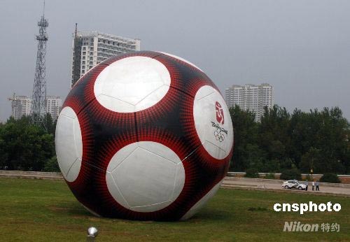 7月30日,秦皇島市區(qū)內(nèi)巨大的足球雕塑。當(dāng)日,奧運(yùn)火炬在河北省秦皇島市進(jìn)行傳遞。秦皇島是北京奧運(yùn)會(huì)足球比賽分賽場(chǎng)之一。 中新社發(fā) 廖攀 攝