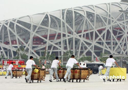 圖為參演人員攜帶各種道具來(lái)到鳥(niǎo)巢。 中新社發(fā) 武仲林 攝
