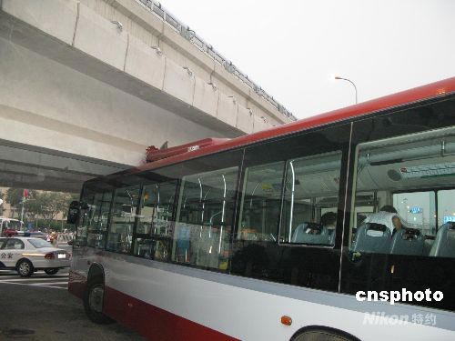 30日晚,記者目擊了北京奧運(yùn)開(kāi)幕式彩排前發(fā)生的一樁交通意外。7點(diǎn)10分,一輛調(diào)度觀眾的公交車,在從鳥(niǎo)巢東門運(yùn)送觀眾前往鳥(niǎo)巢其他入口時(shí),車行至四環(huán)橋引橋下,因公交車司機(jī)誤從小車拐彎道拐彎,車身過(guò)高,撞到鳥(niǎo)巢東門右側(cè)的四環(huán)引橋上,現(xiàn)場(chǎng)發(fā)出巨大響聲,五百米外清晰可聞,車頂撞壞。車身卡在橋下,幸車上只有四五名觀眾,無(wú)人受傷。圖為卡在橋下的公交車。 中新社發(fā) 吳慶才 攝