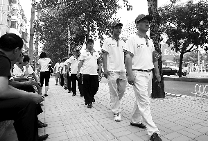 一聲“開始行動(dòng)”后,幾十名和李英軍一樣穿T恤制服、戴袖標(biāo)的大爺大媽,分三組離開“馬家堡東里奧運(yùn)志愿者治安崗”。