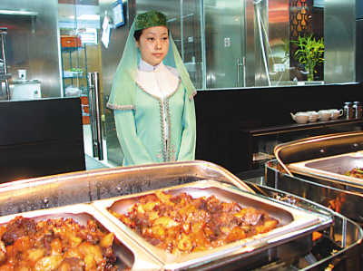 考慮到穆斯林的習俗,在餐廳旁邊還專門設(shè)立了禮拜室,每天都有來自清真寺的阿訇來帶領(lǐng)做禮拜。