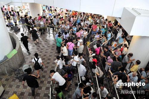 七月三十一日,中銀香港發(fā)售奧運(yùn)紀(jì)念鈔票最后一天,眾多市民到各中銀分行排隊(duì)輪候購買。 中新社發(fā) 譚達(dá)明 攝