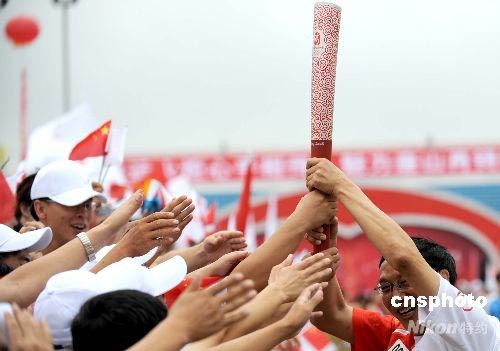 7月31日,奧運火炬在河北唐山傳遞,在傳遞過程中,唐山民眾同火炬手熱捧“祥云”火炬。中新社發(fā) 廖攀 攝