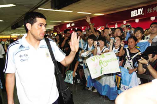 12時(shí)15分,阿根廷足球隊(duì)稍事休息后,魚貫步出候機(jī)大廳,早已等候在此的上海球迷立即歡呼起來,他們有的舉著寫有運(yùn)動(dòng)員名字的牌子,有的高喊運(yùn)動(dòng)員的名字。里克爾梅等球星,也熱情地向球迷們揮手致意。
