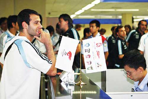 飛機(jī)比預(yù)定的時(shí)間晚到了幾分鐘,11時(shí)45分,阿根廷國奧隊(duì)的運(yùn)動(dòng)員走出機(jī)艙,他們談笑風(fēng)生,顯得非常輕松。通過檢測(cè)體溫區(qū)域后,馬斯切拉諾第一個(gè)站到了邊檢驗(yàn)證臺(tái)前!澳茫 边厵z民警用西班牙語向這位著名球員表示問候,并很快幫他辦理了入境通關(guān)手續(xù)。