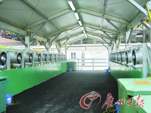 在房間內(nèi),馬匹可以“嘆空調(diào)”,在室外怎么辦呢?記者在幾個室外練習場的旁邊看到了兩座降溫站,所謂降溫站,就是用一種特殊的風扇將水吹成霧狀,霧狀的水噴到馬兒的身上,能夠起到降溫的作用。一位工作人員向記者介紹,如果馬匹需要迅速將體溫降下來,則可使用水槍,他交給記者試了一下,水量很大卻柔和,既能給馬匹迅速降溫,也不至于噴力太大驚嚇到馬匹。為了應付高溫的天氣,降溫站的旁邊儲存了大量的冰塊,降溫使用的水都是冰塊融化后的冰水,降溫效果十分明顯。工作人員還告訴記者,他們24小時都得值班,因為有些騎手喜歡晚上訓練,有些騎手則喜歡早起訓練,都是為了避開高溫天氣。