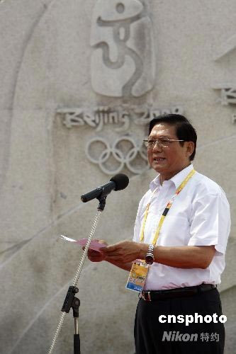 8月1日,北京奧運(yùn)村“和平友誼墻”正式啟動(dòng)。圖為北京奧組委主席劉淇在啟動(dòng)儀式上致詞。中新社發(fā) 杜洋 攝