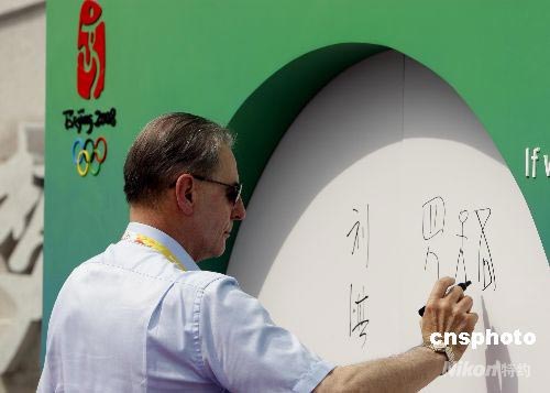 8月1日,北京奧運(yùn)村“和平友誼墻”正式啟動(dòng)。國(guó)際奧委會(huì)主席羅格在和平友誼墻“簽名墻”上簽下自己的中文名字。 中新社發(fā) 杜洋 攝