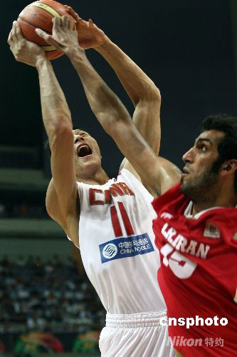 圖為中國(guó)隊(duì)11號(hào)易建聯(lián)(左)在比賽中。