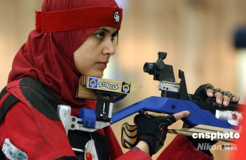 8月2日上午,埃及女神槍手SHIMAA·HASHAD在北京奧運會射擊場10米靶場訓練時槍槍不離靶心。中新社發(fā) 任晨鳴 攝