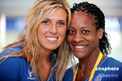 8月2日下午,意大利男排和女排運動員抵達(dá)北京首都國際機(jī)場,征戰(zhàn)北京奧運會。圖為意大利女排球星阿奎羅(右)和主攻手皮其尼尼在一起。 中新社發(fā) 陳文 攝