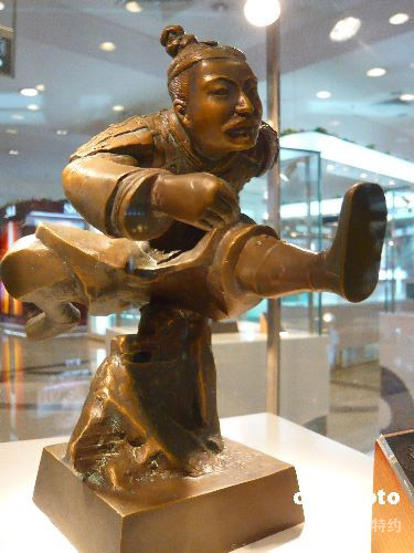 2008年8月2日,在北京一商城內(nèi),一套具有中國特色的名為“尚勇”的兵馬俑運(yùn)動(dòng)雕塑套裝和市民見面,該禮品是專門為迎接北京奧運(yùn)開發(fā)的中國特色禮品。該款雕塑將籃球、足球、體操、跨欄、棒球五種現(xiàn)代奧運(yùn)項(xiàng)目與秦兵馬俑相結(jié)合,賦予古老藝術(shù)元素以新的生命。雕塑保留了兵馬俑外披鎧甲、翹首仰頸、氣宇軒昂等待出征的氣勢。雕塑主體與底座連為一體,使用青銅鑄造完成。 中新社發(fā) 樊甲山 攝