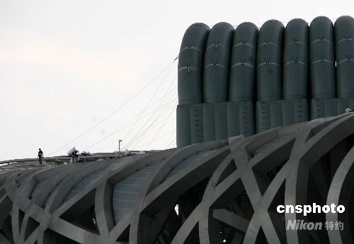 8月2日,北京奧運(yùn)會開幕式第二次彩排在國家體育場“鳥巢”進(jìn)行。圖為工作人員在“鳥巢”頂部布置。 中新社發(fā) 武仲林 攝
