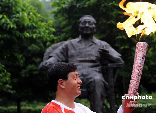 鄧小平故里牌坊村村民李良國在小平銅像前傳遞火炬。 中新社發(fā) 廖攀 攝