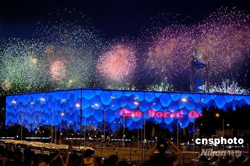 圖:“水立方”上空試放焰火