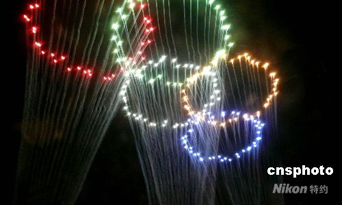 圖:北京天安門廣場(chǎng)首次試放“五環(huán)”禮花