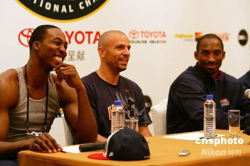8月2日,巨星云集的美國國家男籃抵達上海,備戰(zhàn)即將進行的北京奧運會。他們將在滬與俄羅斯、澳大利亞男籃進行兩場比賽,為奧運熱身。當日,美國男籃主教練與部分球員出席媒體見面會,回答中外媒體提問。圖為左起德懷特·霍華德 (Dwight Howard)、賈森·基德 (Jason Kidd)、科比·布萊恩特 (Kobe Bryant)在輕松回答記者提問。中新社發(fā) 湯彥俊 攝