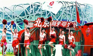 今天清晨6點(diǎn),奧運(yùn)會火炬北京傳遞的第一輛花車在鳥巢前亮相。 安旭東攝