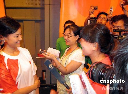八月四日,奧運火炬北京段傳遞路線和部分火炬手名單公布。中國知名歌唱家宋祖英在首場新聞發(fā)布會上亮相,宣布將擔任火炬手。宋祖英將出現(xiàn)在八月七日北京地壇火炬?zhèn)鬟f活動現(xiàn)場。在此之前的火炬?zhèn)鬟f活動中,較少出現(xiàn)火炬手提前曝光、與媒體會面的情形。中新社發(fā) 許曉青 攝