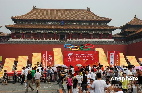 8月5日,北京故宮午門外廣場(chǎng)設(shè)立奧運(yùn)會(huì)火炬?zhèn)鬟f起跑儀式大型舞臺(tái)。該舞臺(tái)縱深12米,寬42米,最高點(diǎn)達(dá)4.8米,由多幅奧運(yùn)噴繪以及巨型五環(huán)等元素組成。舞臺(tái)四周將搭建玻璃鋼仿制的漢白玉欄桿,兩側(cè)甬道將設(shè)立記者席和觀眾席,預(yù)計(jì)可容納500名記者以及3000名左右觀眾。中新社發(fā) 張雙雙 攝