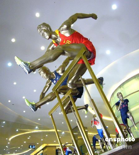 8月4日,隨著北京奧運的臨近,王府井東方新天地開始展示各類體育運動的人物形象,其中“劉翔跨欄”的瞬間成為商場內最引人注目的焦點。中新社發(fā) 玉龍 攝