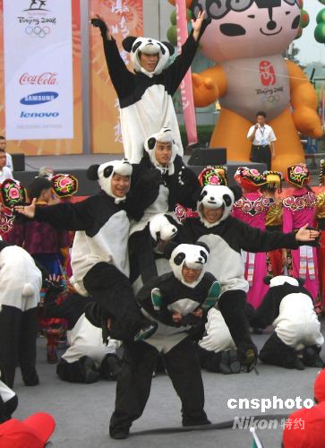 8月5日上午,奧運(yùn)火炬在成都傳遞,多才多藝的成都人在火炬?zhèn)鬟f起點(diǎn)“成都出口加工園”舉行了精彩的文藝表演。圖為裝扮成大熊貓的雜技演員在表演。中新社發(fā) 黃永莉 攝