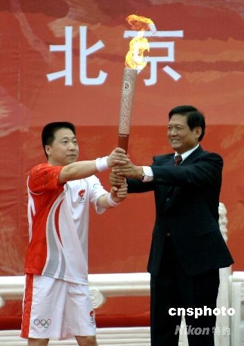 8月6日上午,北京奧運(yùn)火炬?zhèn)鬟f在午門正式開始。圖為“航天英雄”楊利偉從北京市委書記劉淇手里接過首棒火炬。中新社發(fā) 王東明 攝