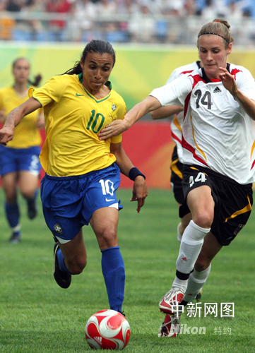 8月6日下午17時,隨著主裁判的哨音鳴響,巴西女足與德國女足展開激戰(zhàn),圖為世界足球小姐瑪塔(黃衣)帶球突破。中新社記者 張宇 攝