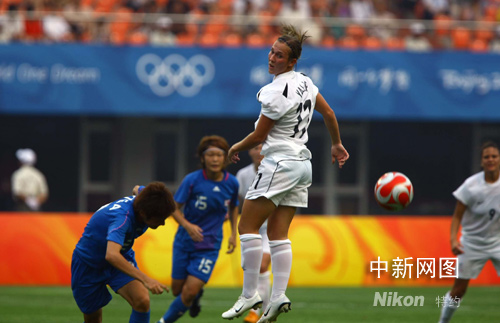 8月6日,北京奧運(yùn)會(huì)秦皇島足球分賽場(chǎng)首場(chǎng)女足預(yù)賽,日本對(duì)新西蘭2:2戰(zhàn)平。圖為新西蘭隊(duì)柯斯蒂·耶洛普頭球瞬間。中新社記者 劉新攝